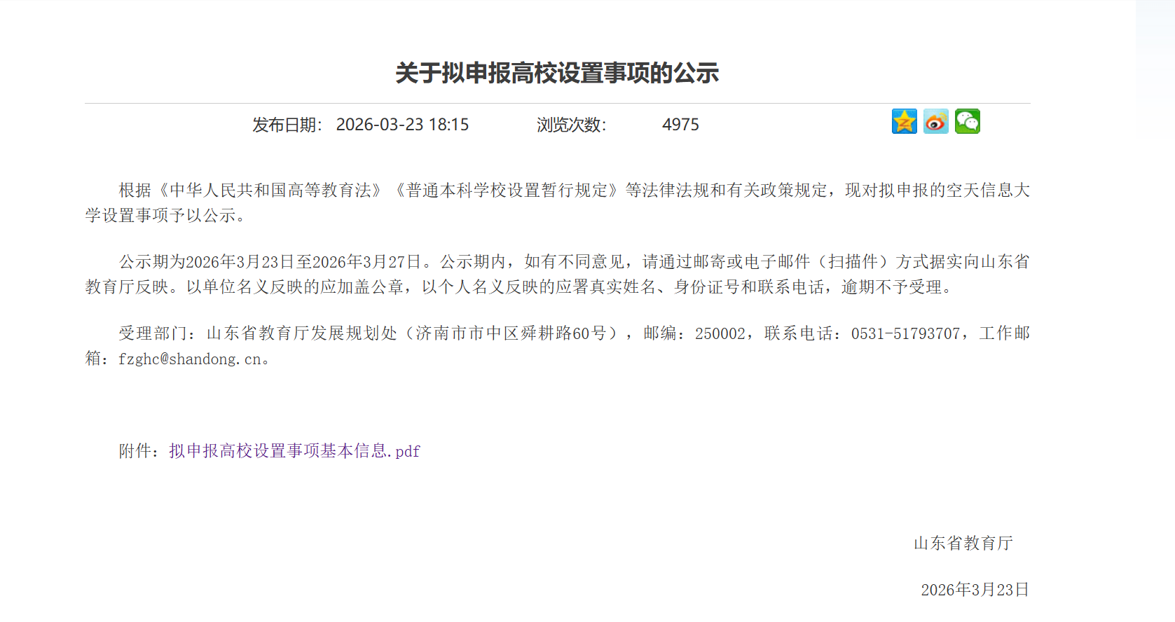 3月23日,山东省政府发布《关于拟申报高校设置事项的公示》,根据《中华人民共和国高等教育法》《普通本科学校设置暂行规定》等法律法规和有关政策规定,现对拟申报的空天信息大学设置事项予以公示。公示显示空天信息大学办学体制为公办,办学层次为本科。